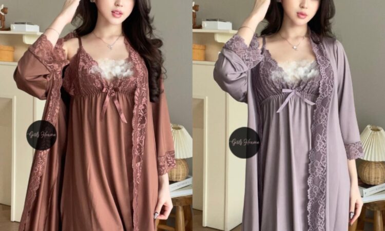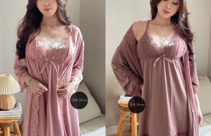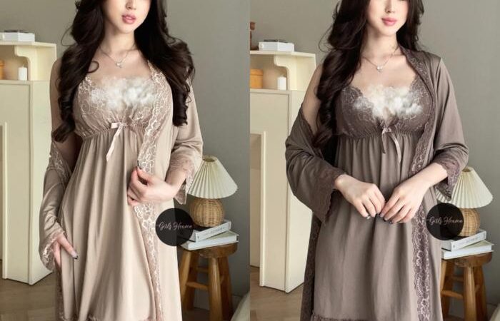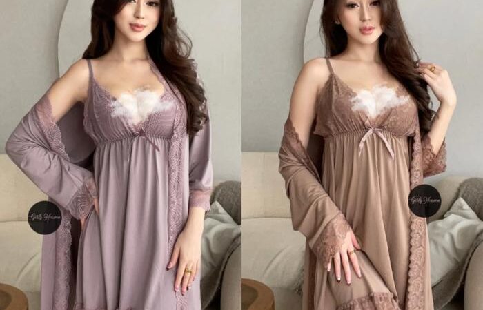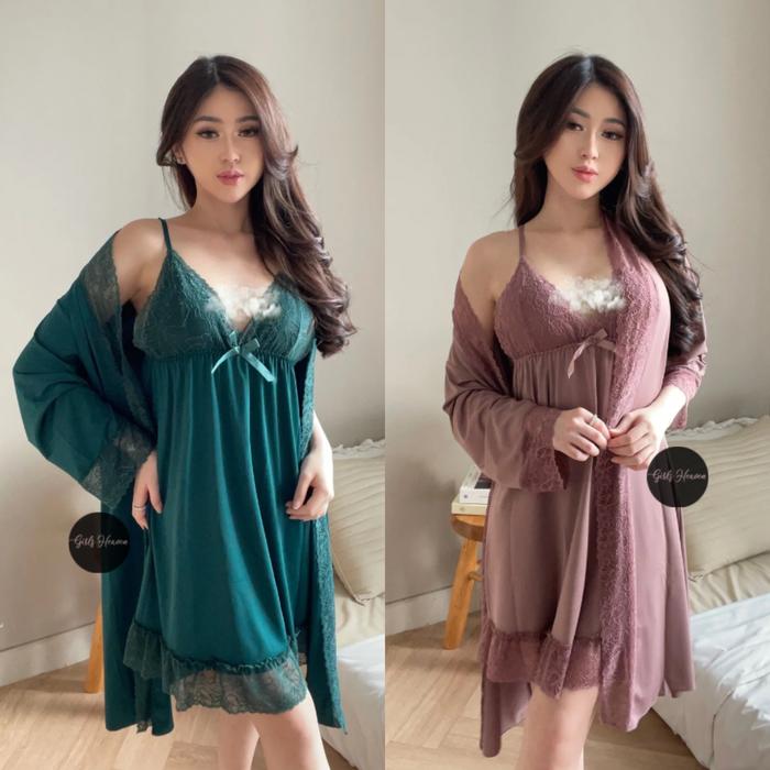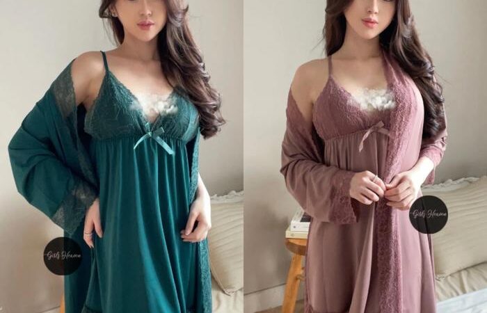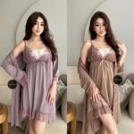 Tampil anggun dan percaya diri dengan set sleepwear eksklusif ini. Perpaduan sempurna antara dress yang feminine dan kimono yang flowgy menciptakan tampilan yang sangat elegan untuk menemani waktu santai atau malam spesial Anda.