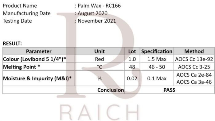 Informasi produk berdasarkan COA, MSDS, dan pengujian oleh RAICH Aromatic. Warna dan tekstur dapat bervariasi antar batch tanpa memengaruhi kualitas. Selalu lakukan uji coba kecil untuk memastikan hasil sesuai ekspektasi.