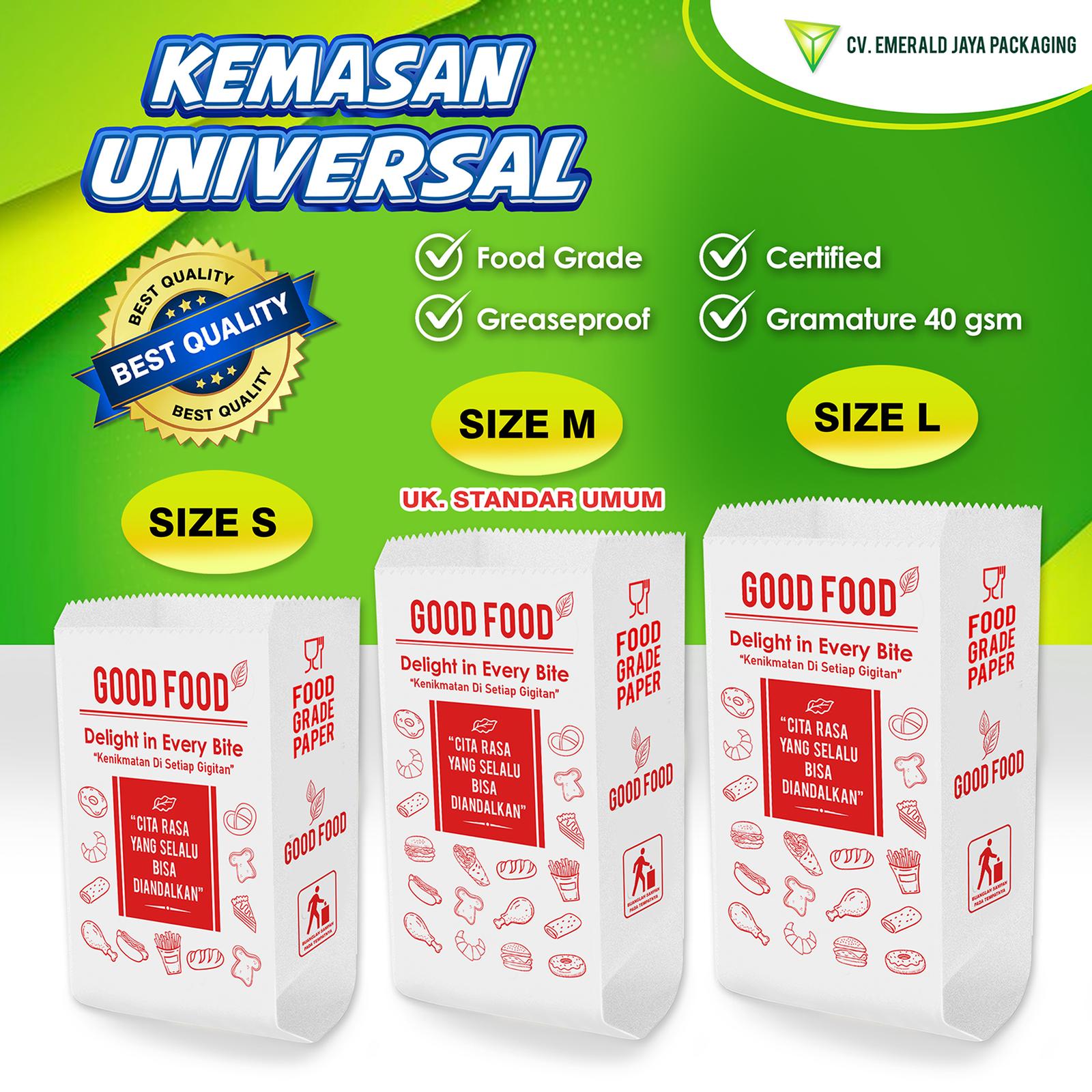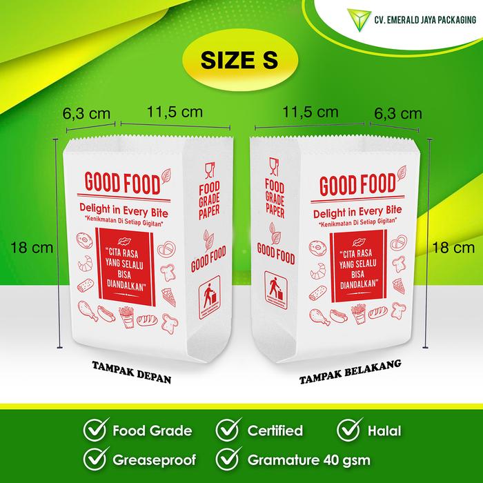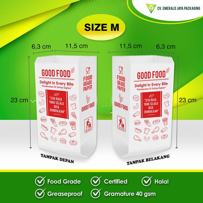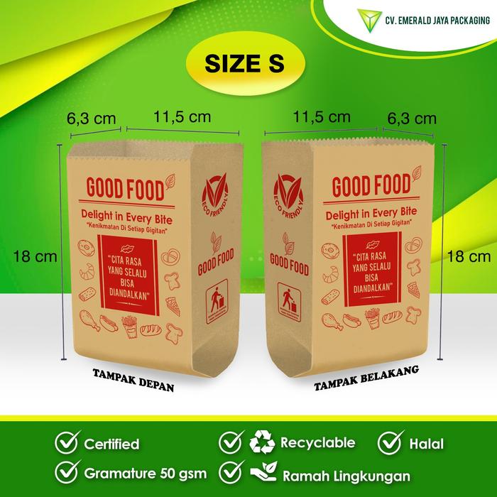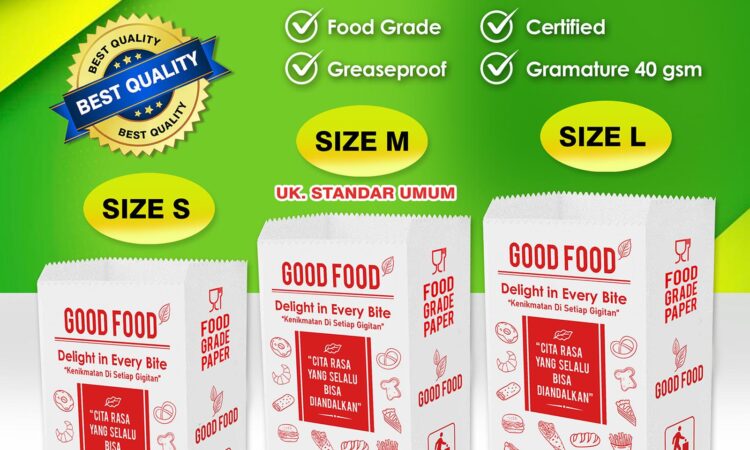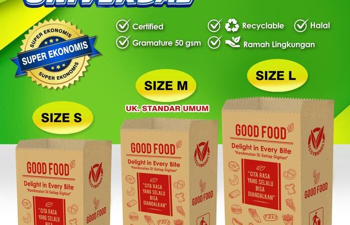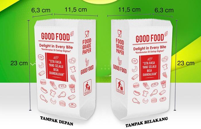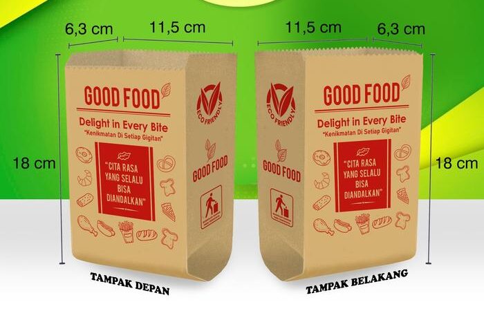Wujudkan komitmen bisnis kuliner Anda yang higienis dan ramah lingkungan dengan Kantong Kertas “GOOD FOOD”. Desainnya yang universal cocok untuk segala jenis makanan, dari gorengan, roti, kue kering, hingga snack. Kemasan siap pakai ini langsung bisa mendongkrak citra produk Anda.