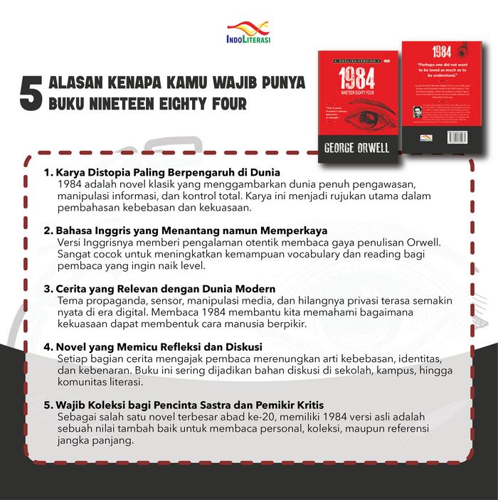 Ikuti perjalanan Winston Smith, seorang pria biasa yang memberanikan diri untuk meragukan dan merindukan kebebasan dalam rezim totaliter yang dikuasai oleh sosok Big Brother yang selalu mengawasi. Setiap halaman membawa Anda lebih dalam ke dalam labirin manipulasi psikologis, di mana sejarah ditulis ulang, bahasa dipersempit (Newspeak), dan pikiran diawasi tanpa ampun.