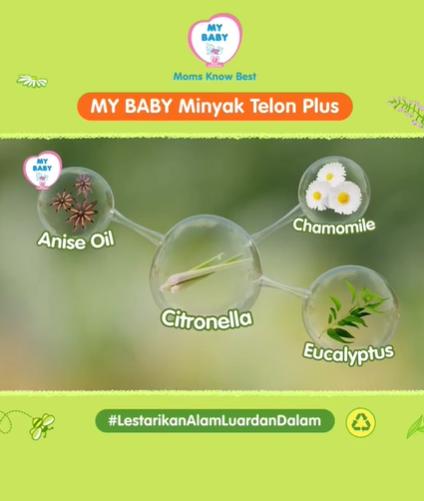 - Minyak Telon: Minyak aromaterapi untuk bayi dengan campuran minyak kayu putih, adas, dan kelapa, berfungsi menghangatkan tubuh dan mencegah perut kembung.