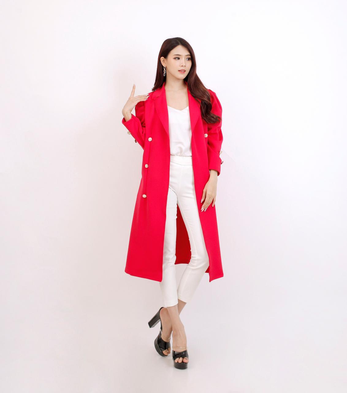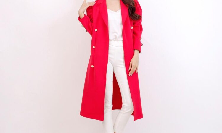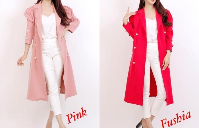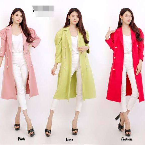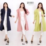 | Model & Desain | Blazer Long Coat dengan panjang 100cm. Kerah blazer klasik, lengan 3/4, dan detail kancing variasi yang unik. |