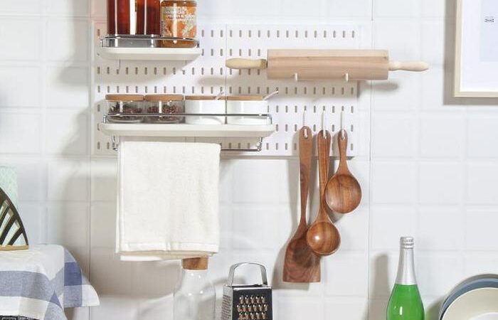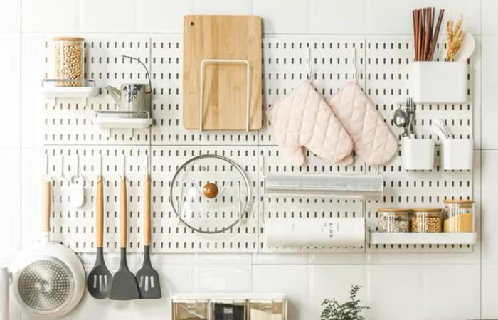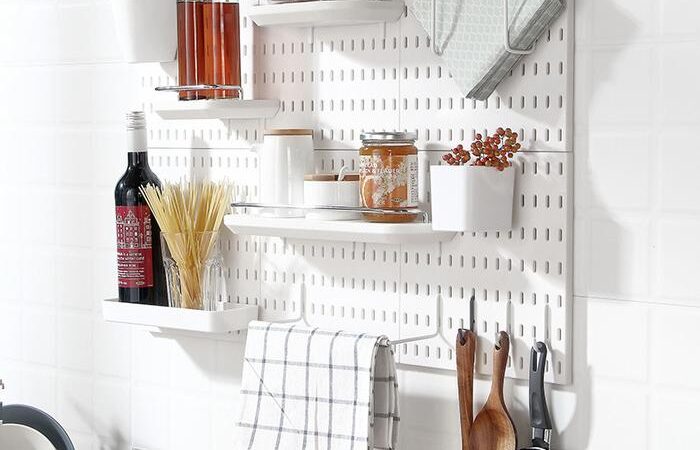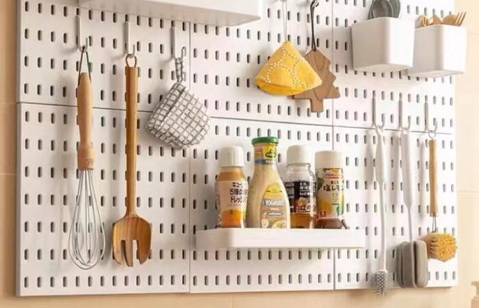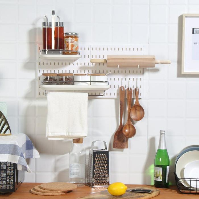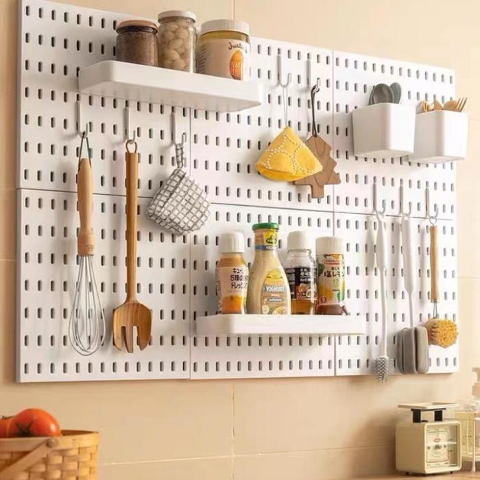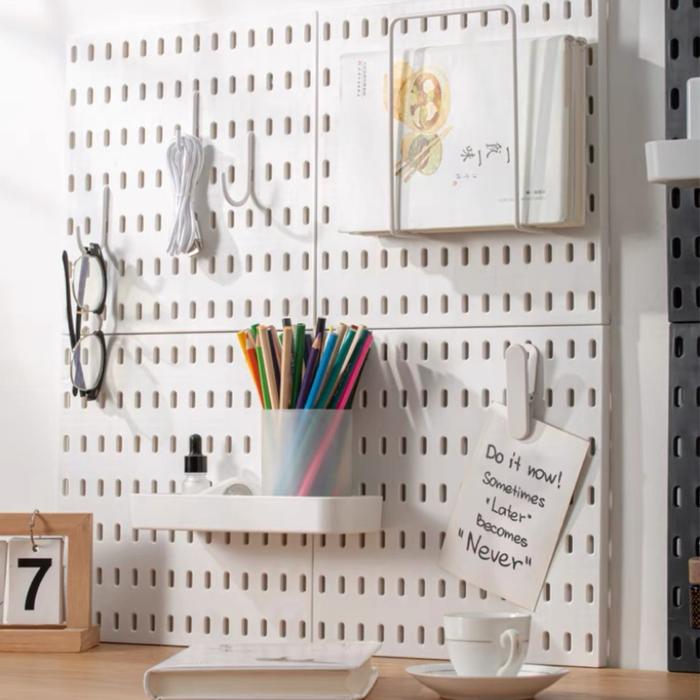 - Peg Board: Papan panel yang memiliki lubang-lubang (biasanya berbentuk kotak) secara beraturan. Lubang-lubang ini berfungsi untuk memasang aksesori seperti hook (kait), rak, atau wadah sehingga dapat diatur dan digantung sesuai keinginan.