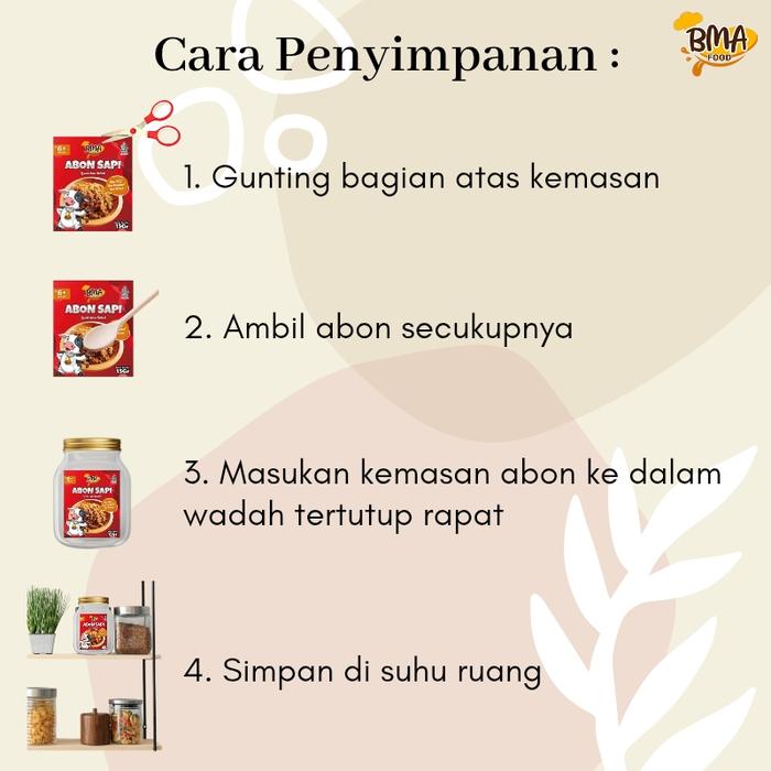 | Abon Sapi 15gr | Tekstur lembut, rasa manis gurih | 6+ bulan |