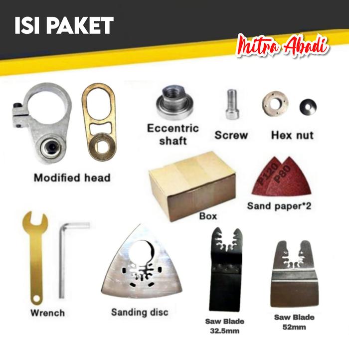 | Mata amplas velcro segitiga, mudah diganti | Melubangi material kayu dan triplek | 1x Poros Eksentrik |