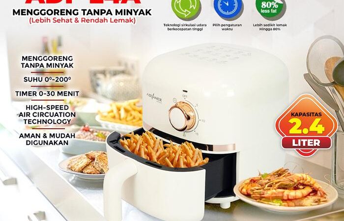 Raih gaya hidup sehat tanpa mengorbankan kenikmatan makanan favorit Anda. Advance Electric Air Fryer ADF-24A menghadirkan solusi menggoreng revolusioner dengan teknologi udara panas yang hanya menggunakan sedikit hingga tanpa minyak sama sekali. Hasilnya? Makanan renyah di luar dan lembut di dalam dengan kandungan lemak hingga 80% lebih rendah.