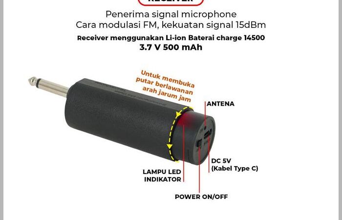 - Baterai Tahan Lama: Dilengkapi 3 baterai Li-ion 500mAh yang dapat diisi ulang (rechargeable) dengan dock charger-nya, memberikan daya hingga 3-4 jam per mikrofon.