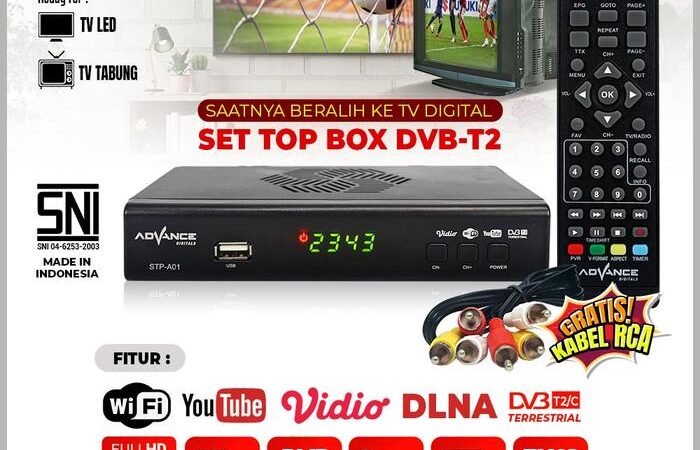 Tingkatkan kualitas tontonan TV tabung atau LED Anda dengan Advance STP-A01 Set Top Box Digital. Nikmati siaran televisi digital berkualitas Full HD tanpa biaya berlangganan bulanan. Dapatkan gambar yang jernih dan tajam, bebas dari gangguan sinyal ‘semut’.