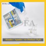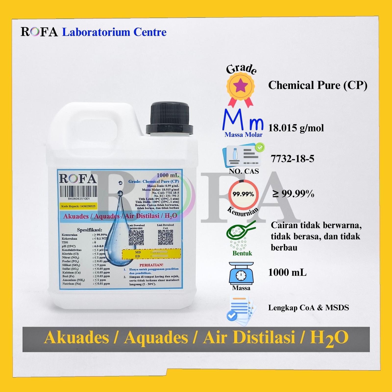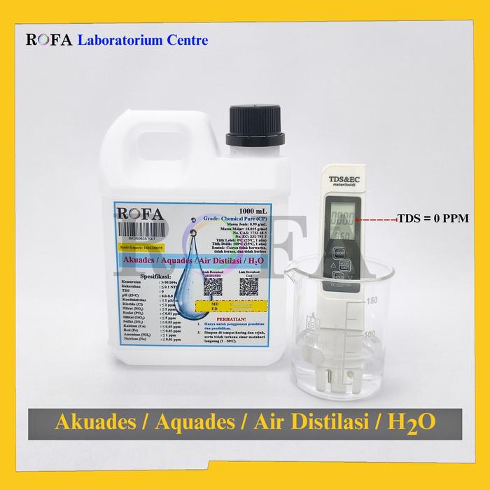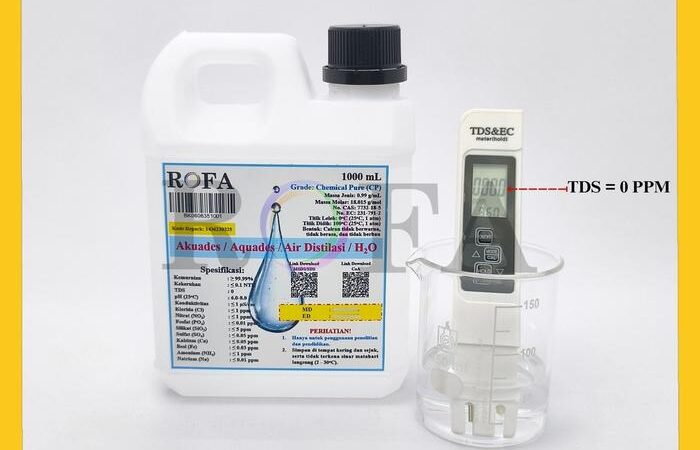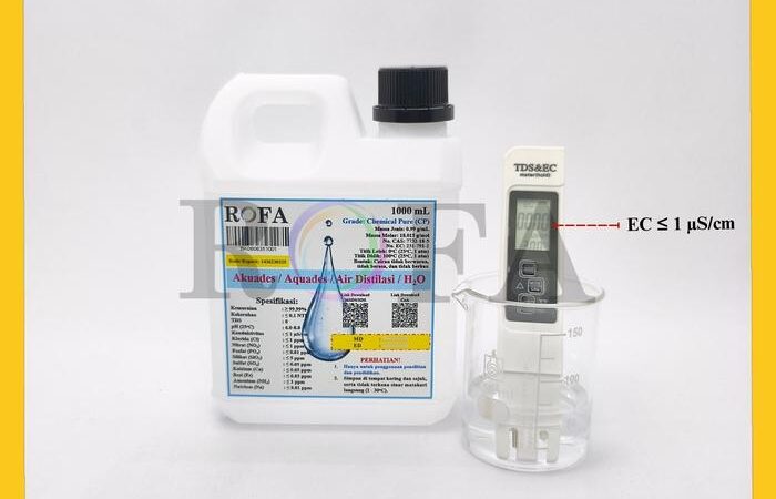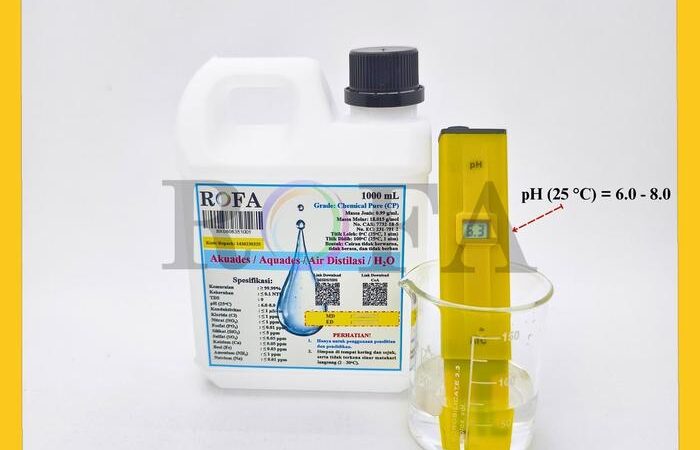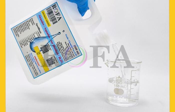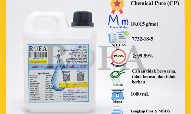 • Akuades/Aquades: Singkatan dari “air aquadestilata”, yang berarti air yang telah dimurnikan melalui proses destilasi (penyulingan) untuk menghilangkan mineral dan pengotor lainnya.