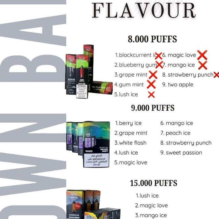 - Puffs: Satuan yang mengindikasikan jumlah hirupan yang dapat dihasilkan oleh sebuah perangkat vape sekali pakai (disposable vape). 15.000 puffs berarti perangkat dirancang untuk dapat digunakan hingga sekitar 15.000 kali hirupan sebelum habis.