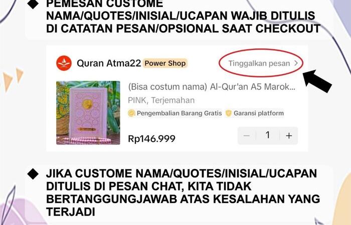 Dicetak oleh penerbit terpercaya, PT ATMA RAYA GRAFIKA, dengan kualitas cetak tajam di atas kertas premium. Segera pesan sekarang juga sebelum kehabisan dan wujudkan Al-Quran spesial dengan nama Anda atau orang tercinta!