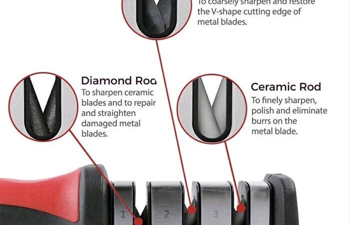 • Sistem Dua Tahap: Fitur pada alat pengasah yang memiliki dua slot atau tahapan kerja. Tahap pertama (coarse/rough) menggunakan material abrasif yang lebih kasar untuk membentuk ulang ujung mata pisau yang sudah tumpul. Tahap kedua (fine) menggunakan material yang lebih halus untuk mengasah dan memperhalus bilah pisau, menghasilkan ketajaman yang optimal.