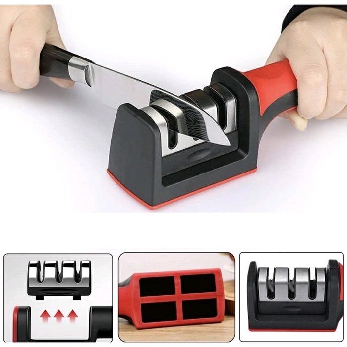 • Sistem Dua Tahap: Fitur pada alat pengasah yang memiliki dua slot atau tahapan kerja. Tahap pertama (coarse/rough) menggunakan material abrasif yang lebih kasar untuk membentuk ulang ujung mata pisau yang sudah tumpul. Tahap kedua (fine) menggunakan material yang lebih halus untuk mengasah dan memperhalus bilah pisau, menghasilkan ketajaman yang optimal.
