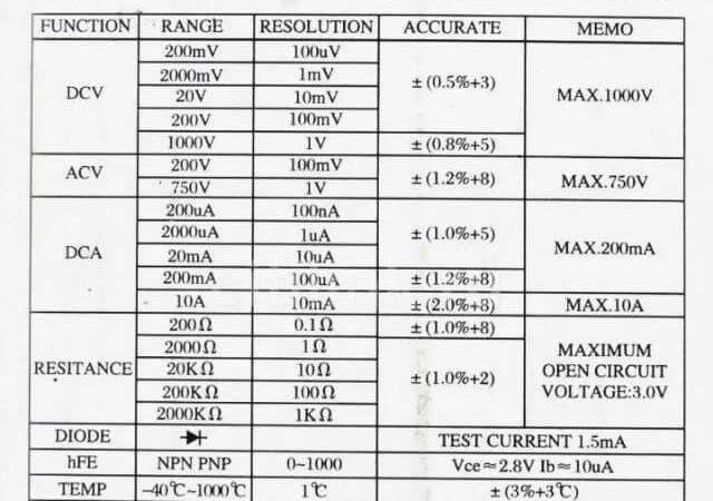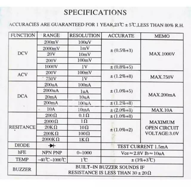 - Transistor hFE: hFE (DC current gain) adalah pengukuran kemampuan transistor untuk memperkuat arus. Multimeter ini dapat menguji dan menampilkan nilai hFE suatu transistor.