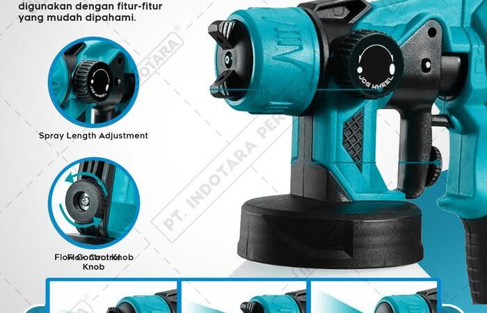 Dilengkapi dengan teknologi motor terbaru yang bertenaga hingga 30,000 RPM, spray gun ini mampu menghasilkan aliran cat yang konsisten hingga 850ml per menit. Fitur adjustable spray length dan flow control knob memberikan kendali penuh atas pola semprotan, memastikan hasil akhir yang halus dan optimal.