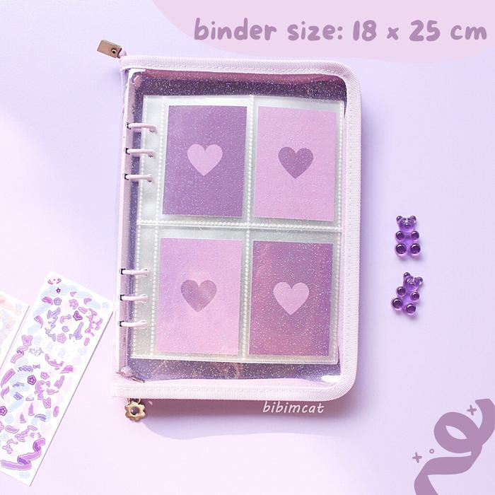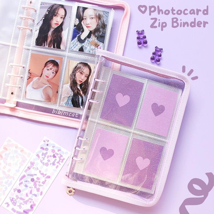 Simpan koleksi photocard (PC) Kpop favoritmu dengan rapi dan stylish menggunakan Album Photocard Binder Zipper A5 6 Ring. Tersedia dalam warna Purple, Pink, Black, dan Blue, binder ini terbuat dari material Glitter Jelly yang eye-catching dilengkapi resleting di sekelilingnya untuk melindungi koleksimu dari debu dan kerusakan.