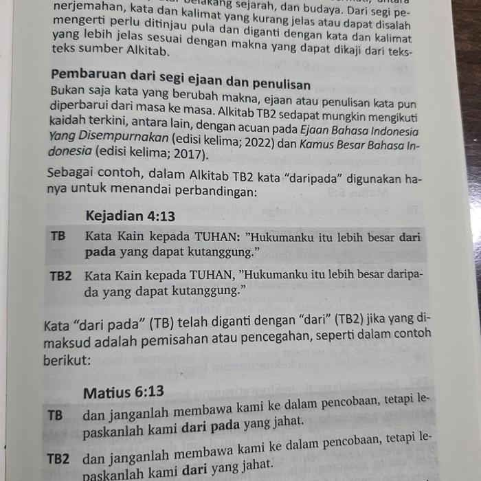 Alkitab Besar TB2 merupakan edisi terkini dari Terjemahan Baru (LAI) yang telah mengalami penyempurnaan dalam bahasa, penerjemahan, dan interpretasi teks. Pembaruan ini mencerminkan perkembangan penelitian naskah-naskah kuno Alkitab (Ibrani, Aram, dan Yunani) serta pemahaman yang lebih mendalam terhadap konteks aslinya.