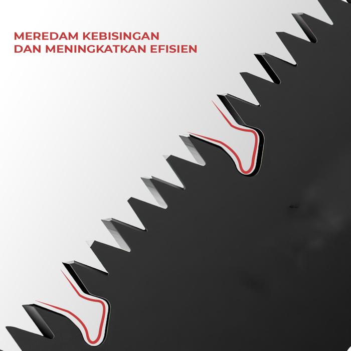 - Mata pisau bergigi besi memotong kayu dengan cepat dan presisi.