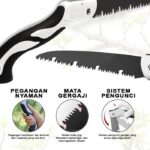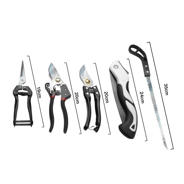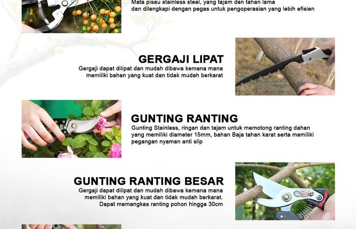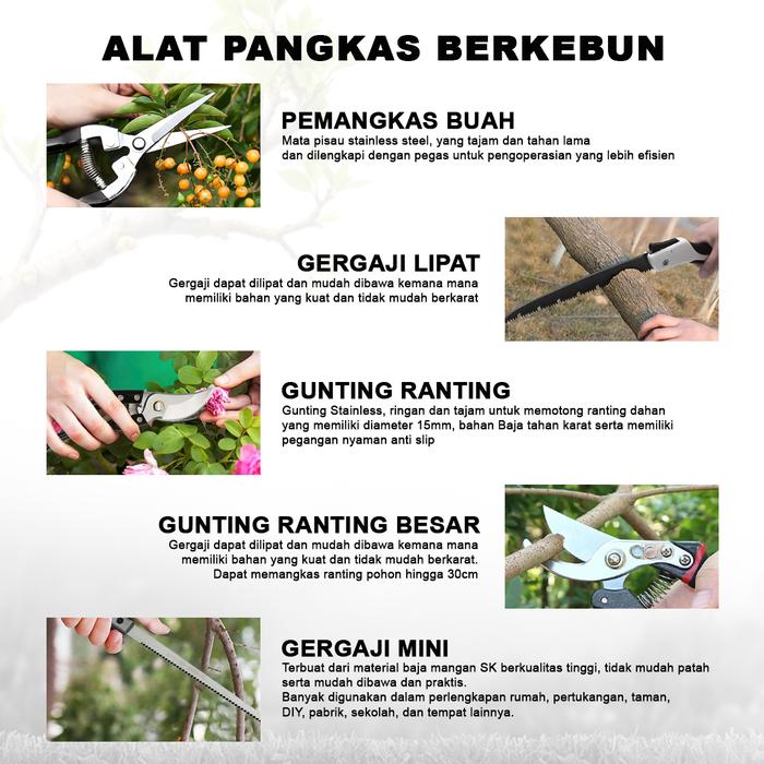 | Kelengkapan Set (5 Pcs) | 3 Gunting Pemangkas untuk ranting, semak, bunga, dan tunas. 1 Gergaji Lipat yang praktis untuk memotong dahan yang lebih tebal. 1 Gergaji Kayu Lurus untuk pekerjaan kayu dan proyek DIY lainnya. |