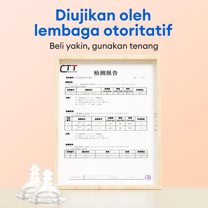 • BPA Free: Tidak mengandung Bisphenol-A (BPA), senyawa kimia yang berpotensi mengganggu kesehatan dan perkembangan bayi.