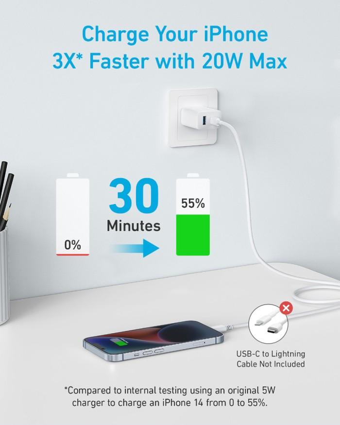 | Kecepatan Super 20W | Isi daya iPhone 15 dari 0 hingga 50% hanya dalam 26 menit – 3x lebih cepat dari charger biasa. |