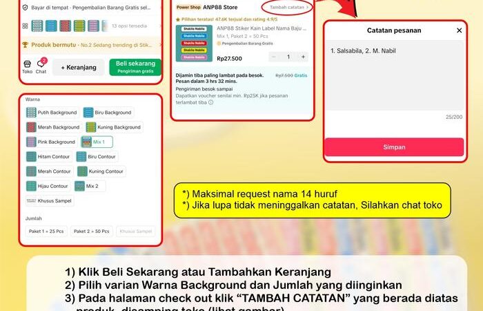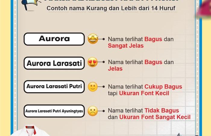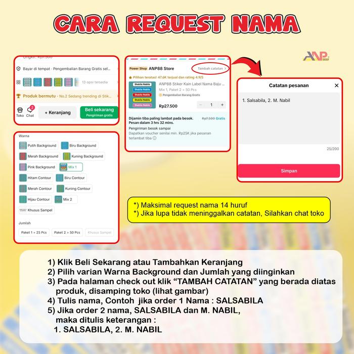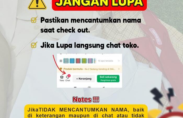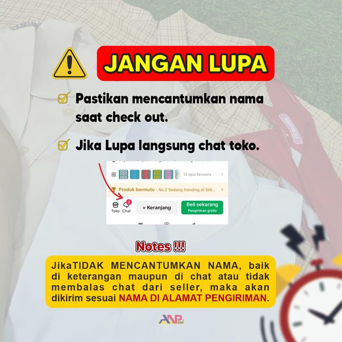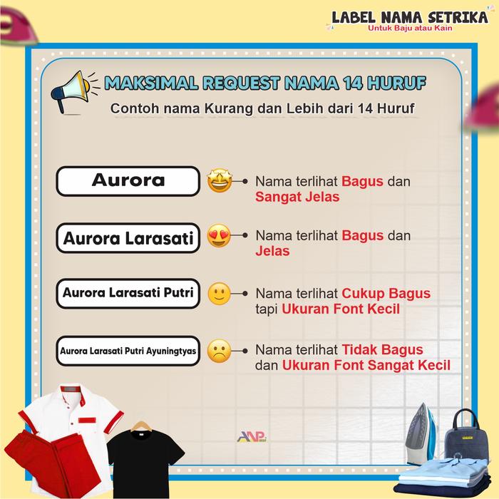 - Pemesanan: Maksimal 14 karakter per nama. Untuk memesan, tambahkan catatan berisi nama yang diinginkan pada saat checkout. Jika memesan lebih dari satu nama, beli dalam jumlah kelipatan dan tulis semua nama secara berurutan.