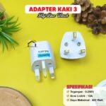 | Adapter Kaki 3 Kecil | Ubah outlet listrik berkaki 3 menjadi lubang universal. Sangat compact dan mudah dibawa, cocok untuk charger HP, kompor listrik, teko, rice cooker, hair dryer, dan perangkat elektronik lainnya. | Tegangan: 0-250V Arus: 13A Daya: 500 watt Satu lubang universal | – |