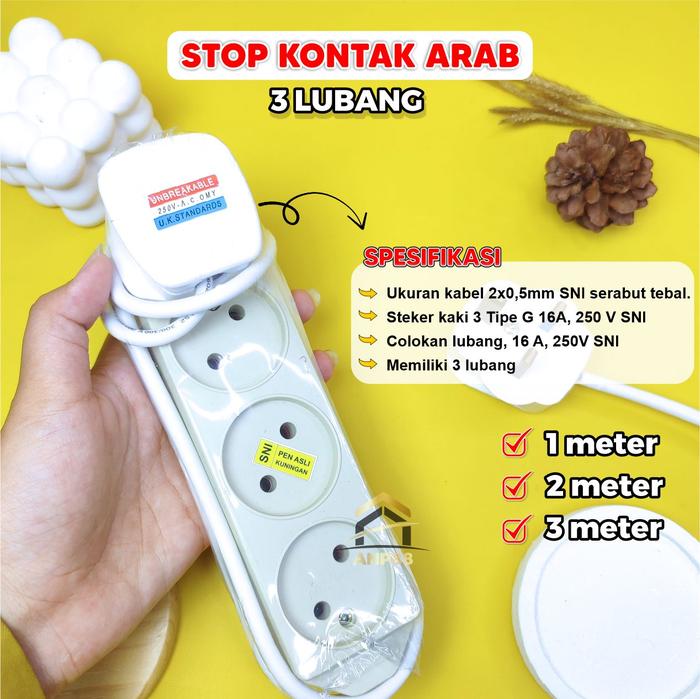 | Stop Kontak Kaki 3 (Extension) | Steker extension dengan kabel panjang. Ideal untuk menghubungkan beberapa perangkat sekaligus di kamar hotel atau penginapan. | Panjang Kabel: 1m, 2m, 3m Kabel: 2×0.75mm SNI Steker & Colokan: 16A, 250V SNI | 2 Lubang 3 Lubang 4 Lubang |