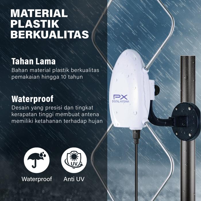 Dibangun dengan material berkualitas, antena ini memiliki lapisan anti-UV dan mekanisme penyegelan anti-air (waterproof) yang membuatnya tahan terhadap cuaca panas dan hujan. Tingkatkan kualitas sinyal Anda hingga 20 dB dan hilangkan gangguan “gambar semut” pada siaran analog saat dipasangkan dengan Set-Top Box (STB). Solusi ideal untuk apartemen dan daerah dengan sinyal lemah.