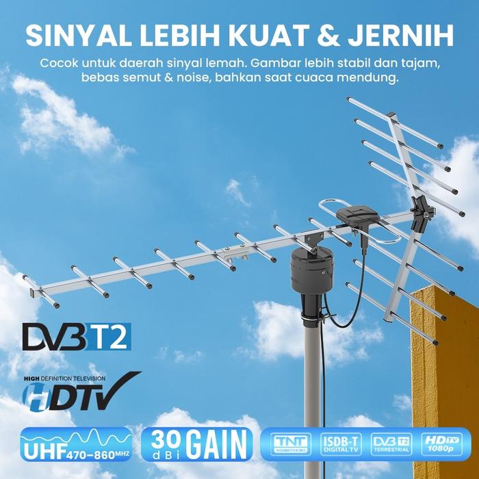 Tingkatkan pengalaman menonton TV digital Anda dengan Antena Outdoor Elston El-77d. Dirancang khusus untuk menangkap siaran digital DVB-T2 di Indonesia, antena ini menjangkau frekuensi UHF 470-810MHz untuk penerimaan yang optimal. Dilengkapi dengan amplifier penguat (gain) tinggi hingga 12 dBi, antena ini mampu menangkap sinyal lebih jelas dan stabil, menghasilkan gambar HD 1080p secara gratis tanpa biaya bulanan.