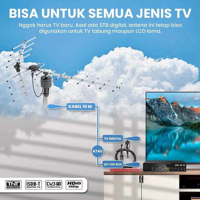 Antena ini kompatibel dengan semua merek TV digital dan Set Top Box (STB), termasuk Finito. Dilengkapi remote control EL-HD90A untuk memudahkan pencarian channel dan pengaturan gain. Dengan kabel coaxial panjang 10 meter dan desain tahan cuaca, pemasangan di luar ruangan menjadi lebih fleksibel dan aman. Antena ini juga dapat menyuplai sinyal untuk dua TV secara bersamaan.