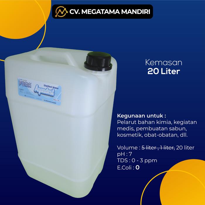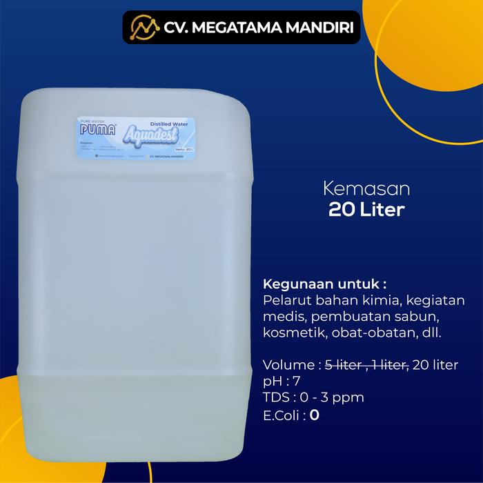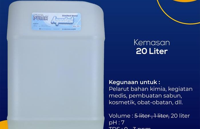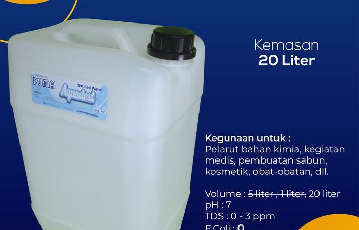 Aquadest (Aqua Destilata) adalah air murni H₂O hasil proses destilasi atau penyulingan yang menyisakan kandungan mineral hampir nol. Produk ini sangat ideal untuk berbagai aplikasi yang memerlukan tingkat kemurnian tinggi, mulai dari kebutuhan medis hingga perawatan kendaraan. Dikemas dalam jerigen 20 liter yang kokoh dan aman untuk pengiriman ke seluruh Indonesia.