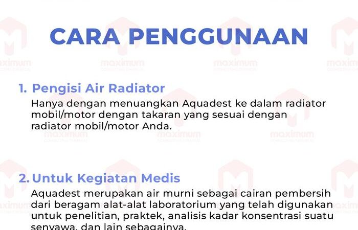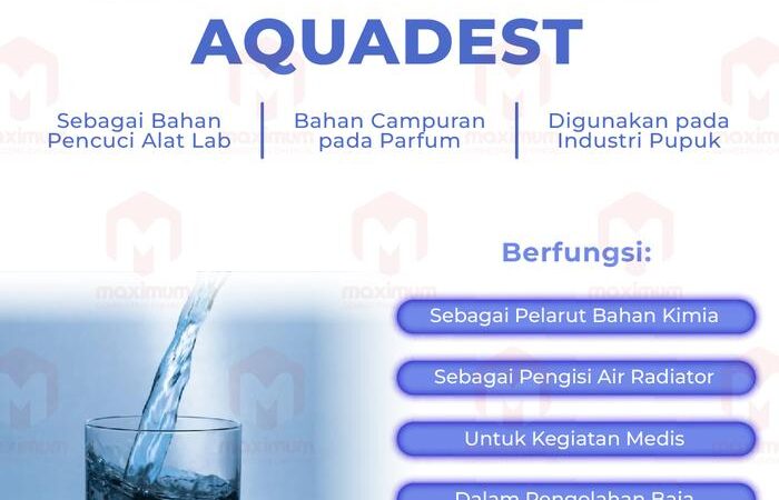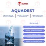 Aquadest (Aqua Destilata): Air murni yang dihasilkan melalui proses destilasi atau penyulingan, di mana air dipanaskan hingga menguap dan kemudian uapnya didinginkan kembali menjadi cairan. Proses ini menghilangkan mineral, garam, dan berbagai kotoran yang terlarut dalam air, sehingga menghasilkan air dengan kemurnian tinggi.