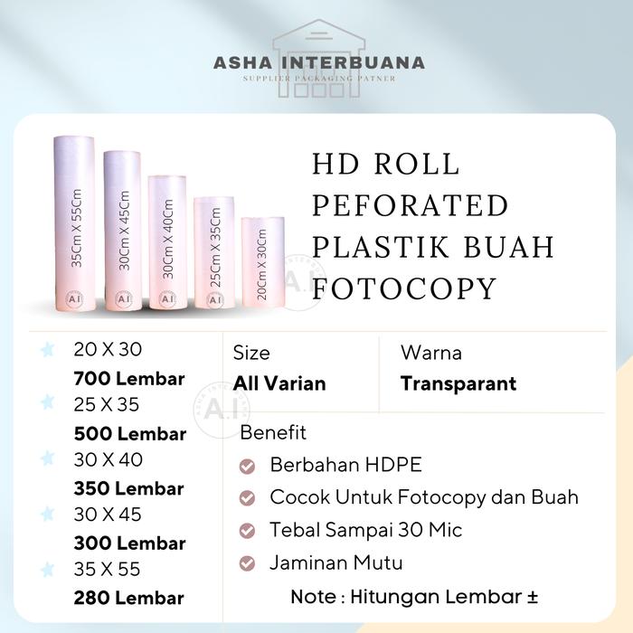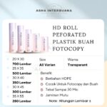 Tingkatkan presentasi dan perlindungan produk Anda dengan Asha Plastik HD Roll. Plastik berkualitas tinggi ini sangat serbaguna, dirancang khusus untuk membungkus buah dan sayuran segar dengan aman serta melindungi dokumen penting di kantor. Terbuat dari bahan baku food grade yang telah terjamin keamanannya, produk ini tidak mudah sobek, transparan, dan sangat mudah untuk digunakan.