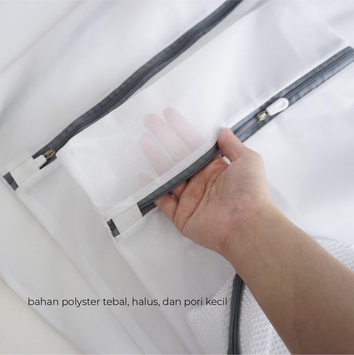 Dibuat dari bahan polyester berkualitas tinggi (70 gsm) yang halus dan memiliki pori-pori kecil untuk sirkulasi air yang lancar tanpa merusak kain. Dilengkapi dengan retsleting yang kokoh dan memiliki tempat penyimpanan khusus agar tidak menggores pakaian lain saat dicuci.