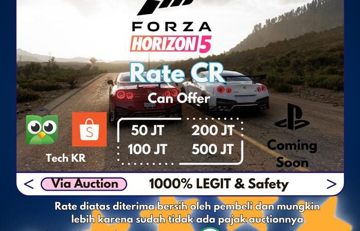 Jual Credit (CR) Forza Horizon 5 via sistem lelang (auction) dengan proses cepat, aman, dan tanpa risiko. Tidak perlu login ke akun pembeli—cukup kirim paket fisik berupa amplop setelah melakukan pemesanan (PO).