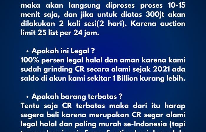 | Legalitas? | 100% legal & halal. CR diperoleh secara alami (grinding sejak 2021). |