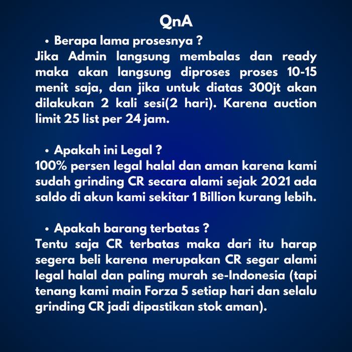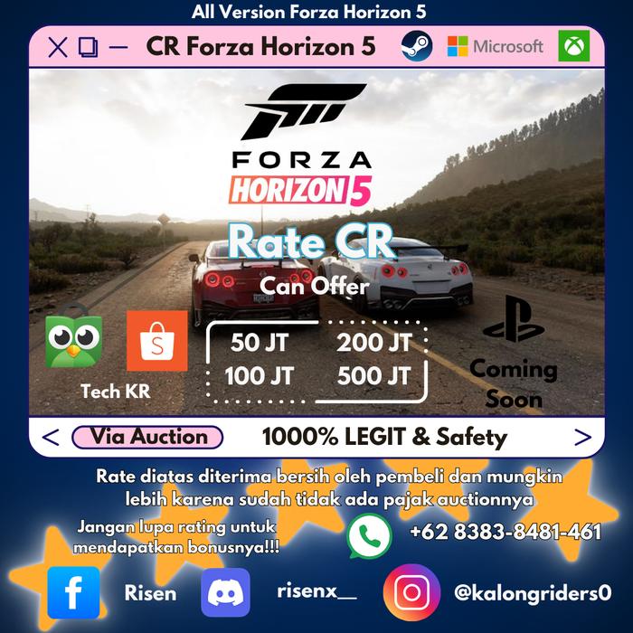 Jual Credit (CR) Forza Horizon 5 via sistem lelang (auction) dengan proses cepat, aman, dan tanpa risiko. Tidak perlu login ke akun pembeli—cukup kirim paket fisik berupa amplop setelah melakukan pemesanan (PO).