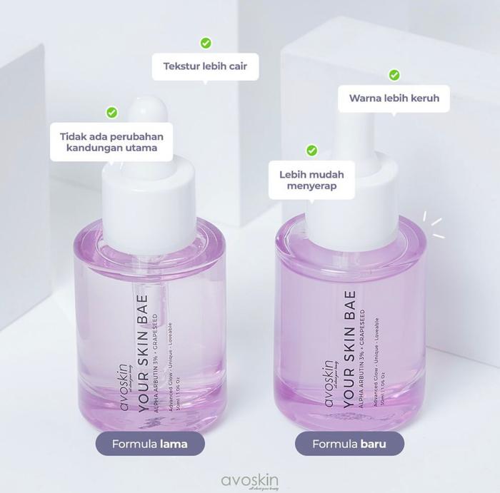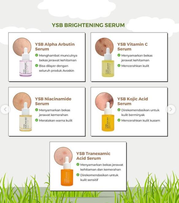 | Alpha Arbutin 3% + Grapeseed | Mencerahkan kulit, mengurangi bercak hitam, menjaga kekencangan, mengurangi kemerahan dan pori-pori. |