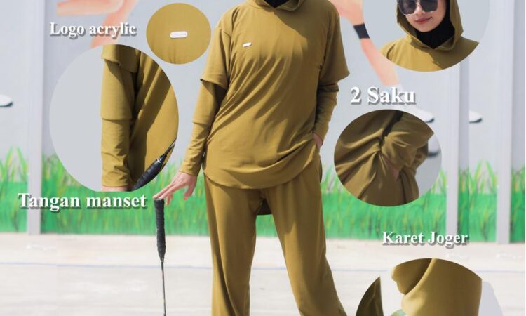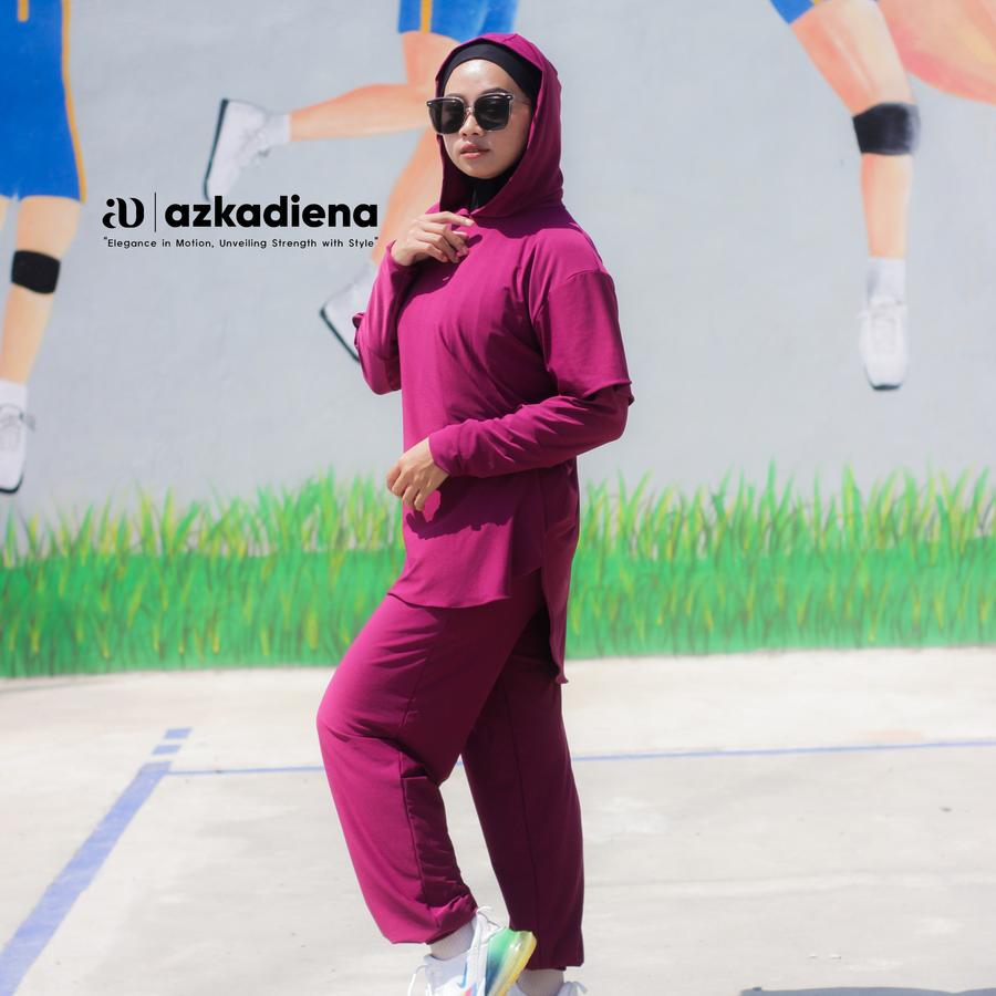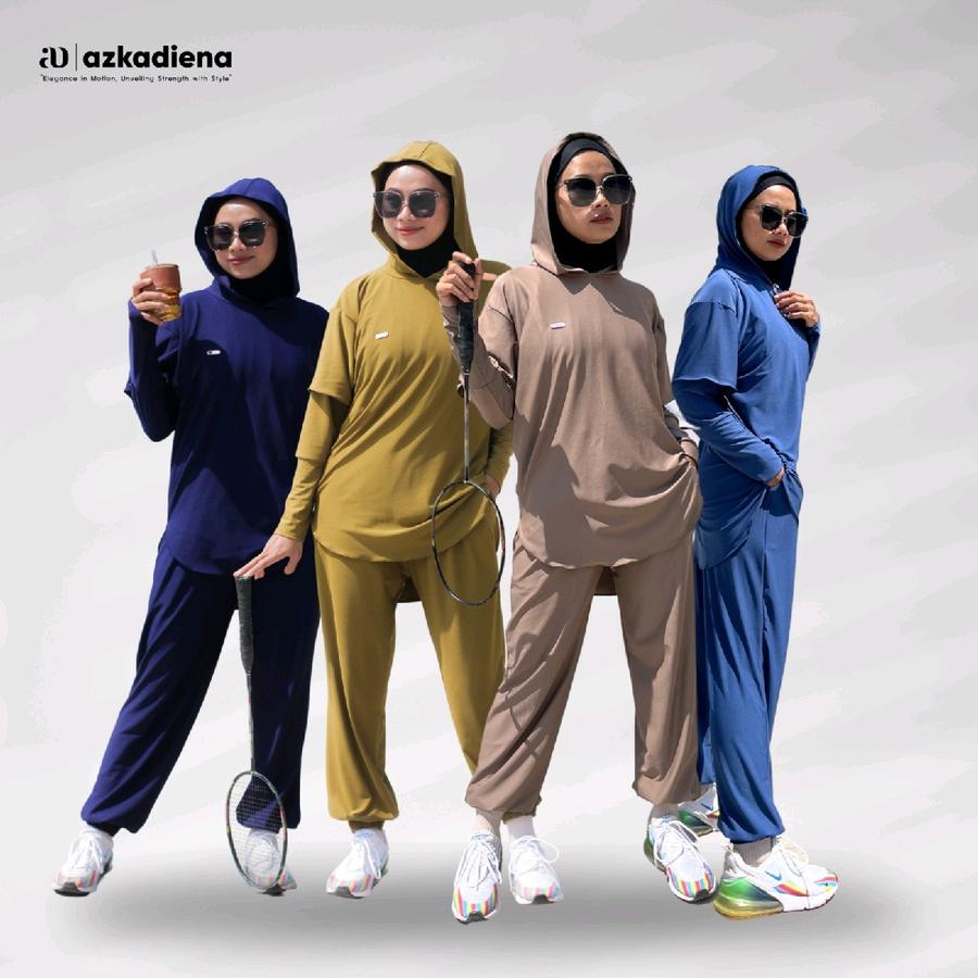 Setelan olahraga muslimah AZKADIENA dengan desain sporty dan syar’i, terdiri atas baju hoodie panjang, celana jogger, dan jilbab hoodie. Terbuat dari Jersey Zoya Premium yang nyaman, adem, dan menyerap keringat, cocok untuk berbagai aktivitas: