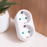 • Schuko: Standar soket listrik yang umum digunakan di Eropa. Ciri khasnya memiliki dua lubang bulat untuk pin arus dan dua klip logam di sisi atas-bawah untuk pin grounding (bumi).