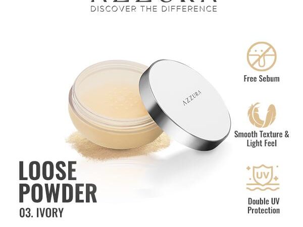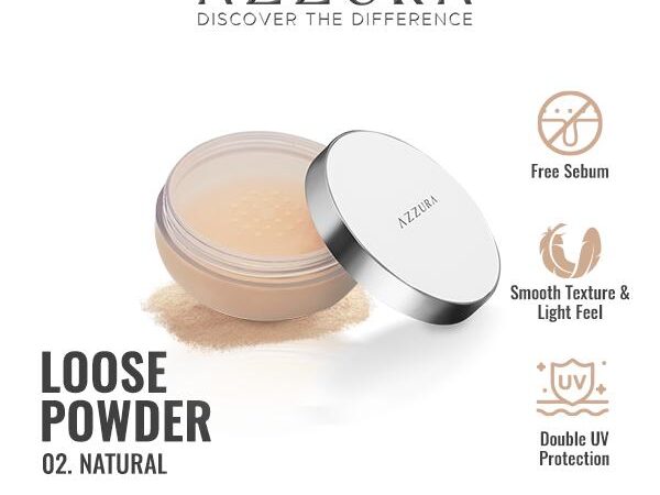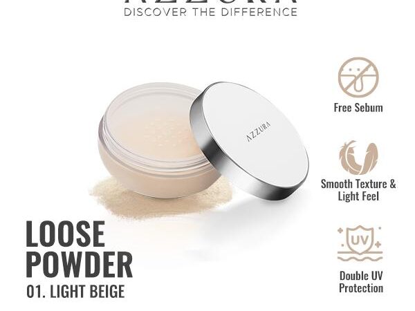 AZZURA Loose Powder 30gr – Bedak tabur dengan tekstur smooth dan ringan untuk wajah segar sepanjang hari. Formulanya mengandung Amazonian Clay yang membantu menyerap minyak berlebih (free sebum) dan Double UV Protection untuk perlindungan optimal dari sinar UV-A dan UV-B.