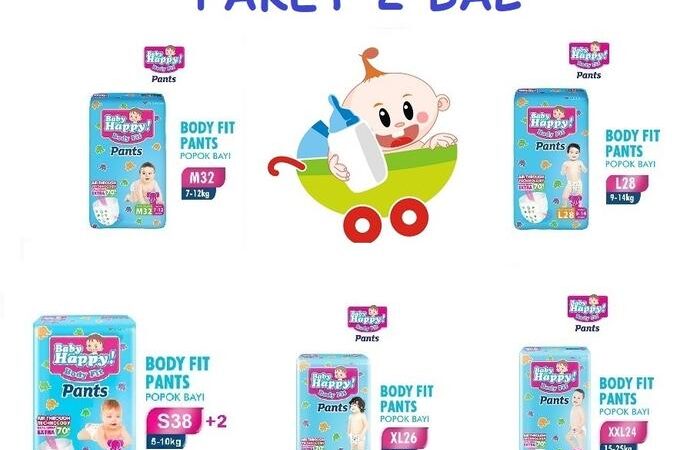 Baby Happy Pants adalah popok celana sekali pakai yang dirancang khusus untuk memberikan kenyamanan maksimal bagi bayi Anda. Dengan ukuran yang beragam (S38+2, M32, L28, XL26, XXL24), popok ini cocok untuk bayi dari berbagai usia dan berat badan.
