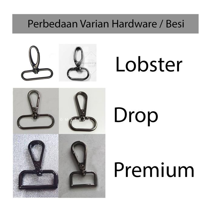 • Hardware: Komponen logam pada sebuah produk tas, seperti pengait, ring, atau gesper. Dalam konteks ini, merujuk pada bagian pengait logam berwarna Black Nickel pada ujung tali.