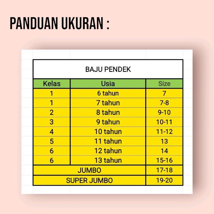 | Tersedia Berbagai Ukuran | Tersedia pilihan ukuran lengkap untuk kelas 1-6 (usia 7-13 tahun), memudahkan pemilihan. |
