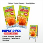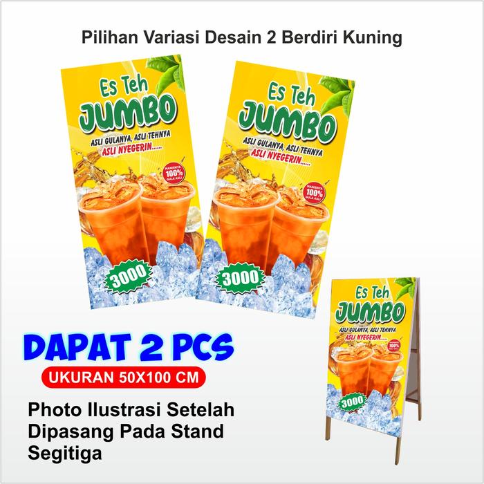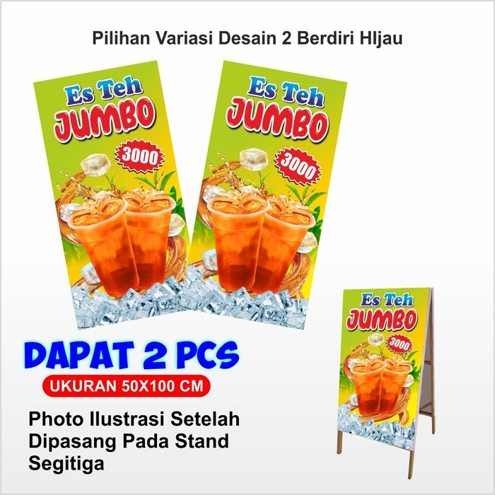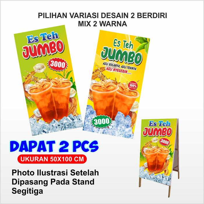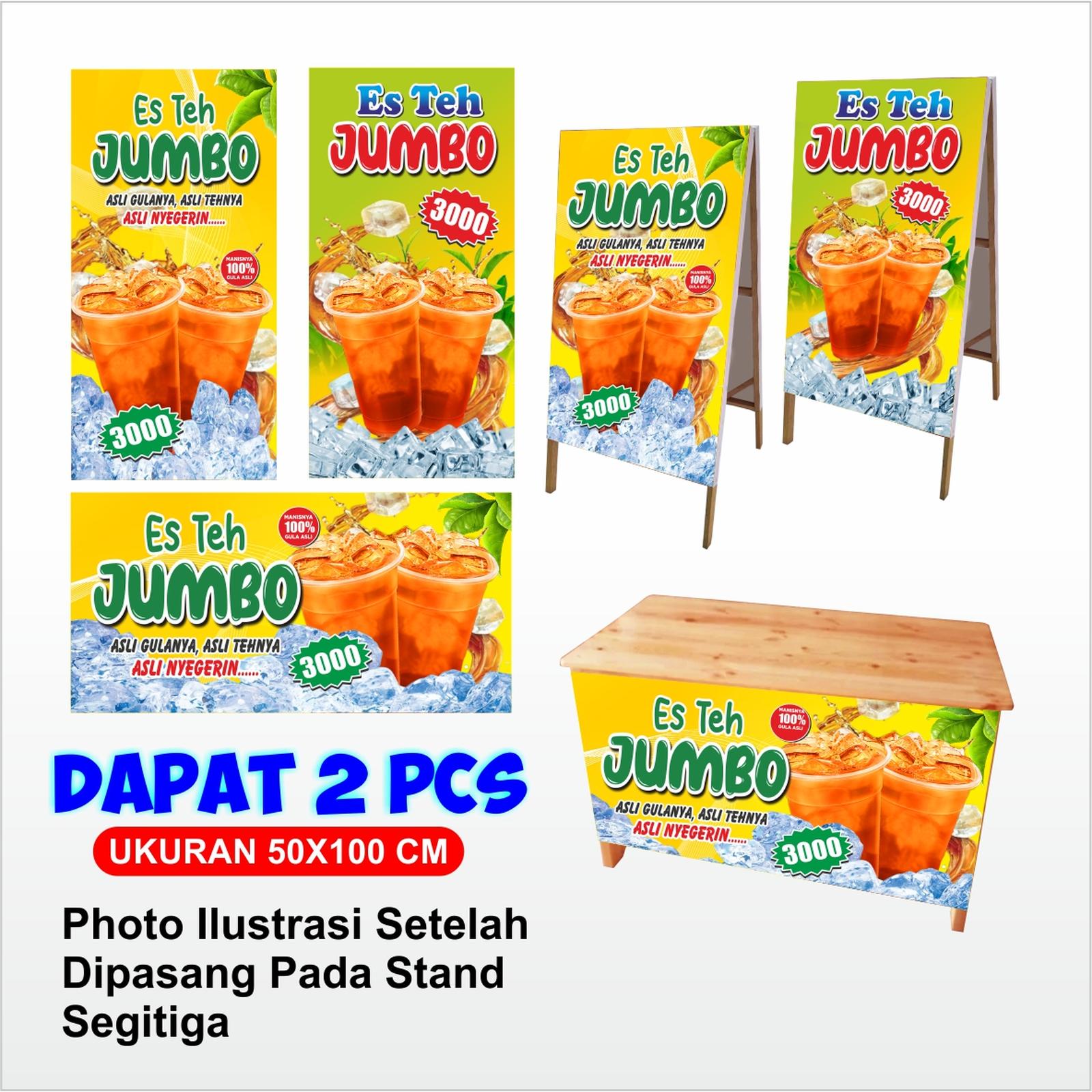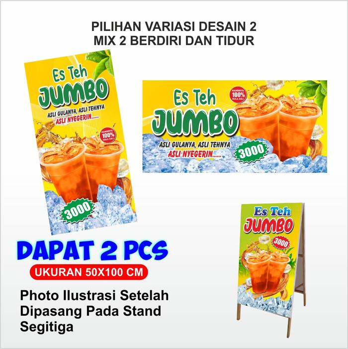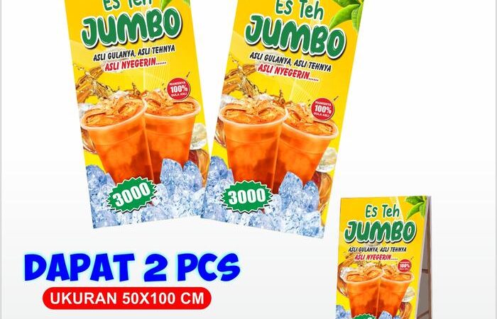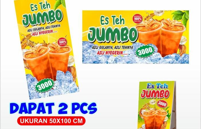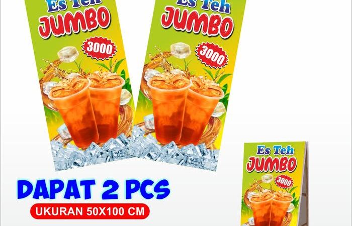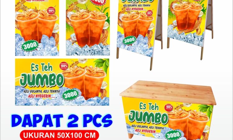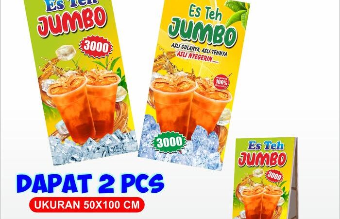 Tingkatkan daya tarik jualan es teh Anda dengan spanduk promosi yang eye-catching! Paket ini berisi 2 banner dengan 2 desain berbeda, sehingga Anda bisa lebih leluasa berpromosi. Banner terbuat dari bahan Flexy / MMT 280 Super Glossy yang tahan lama terhadap cuaca panas dan hujan, serta memiliki permukaan mengilap untuk hasil cetak yang maksimal.