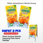 Cocok untuk stand segitiga 50x100cm. Untuk pemasangan yang lebih kuat pada stand kayu/besi, bisa menggunakan double tip dan diperkuat dengan lem Alteco atau lem G. Banner juga bisa dipasang langsung di tembok, pagar, atau area jualan Anda.