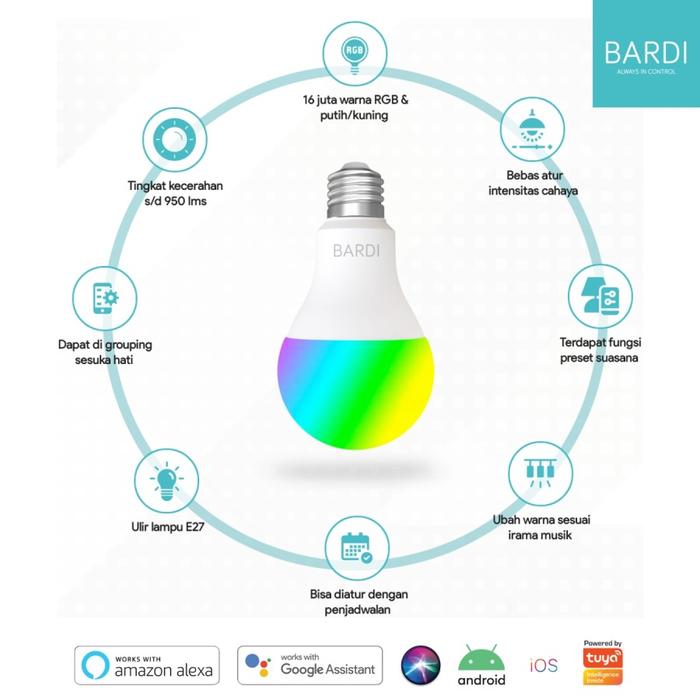Temukan cara baru mengelola pencahayaan rumah dengan Bardi Smart Bulb. Lampu pintar 12W ini menghubungkan Anda ke ekosistem rumah otomatis melalui Wi-Fi, memberikan kendali penuh lewat smartphone dari mana saja. Dengan 16 juta pilihan warna RGBWW, Anda bukan hanya menerangi ruangan, tetapi juga menciptakan suasana yang sempurna untuk setiap momen.