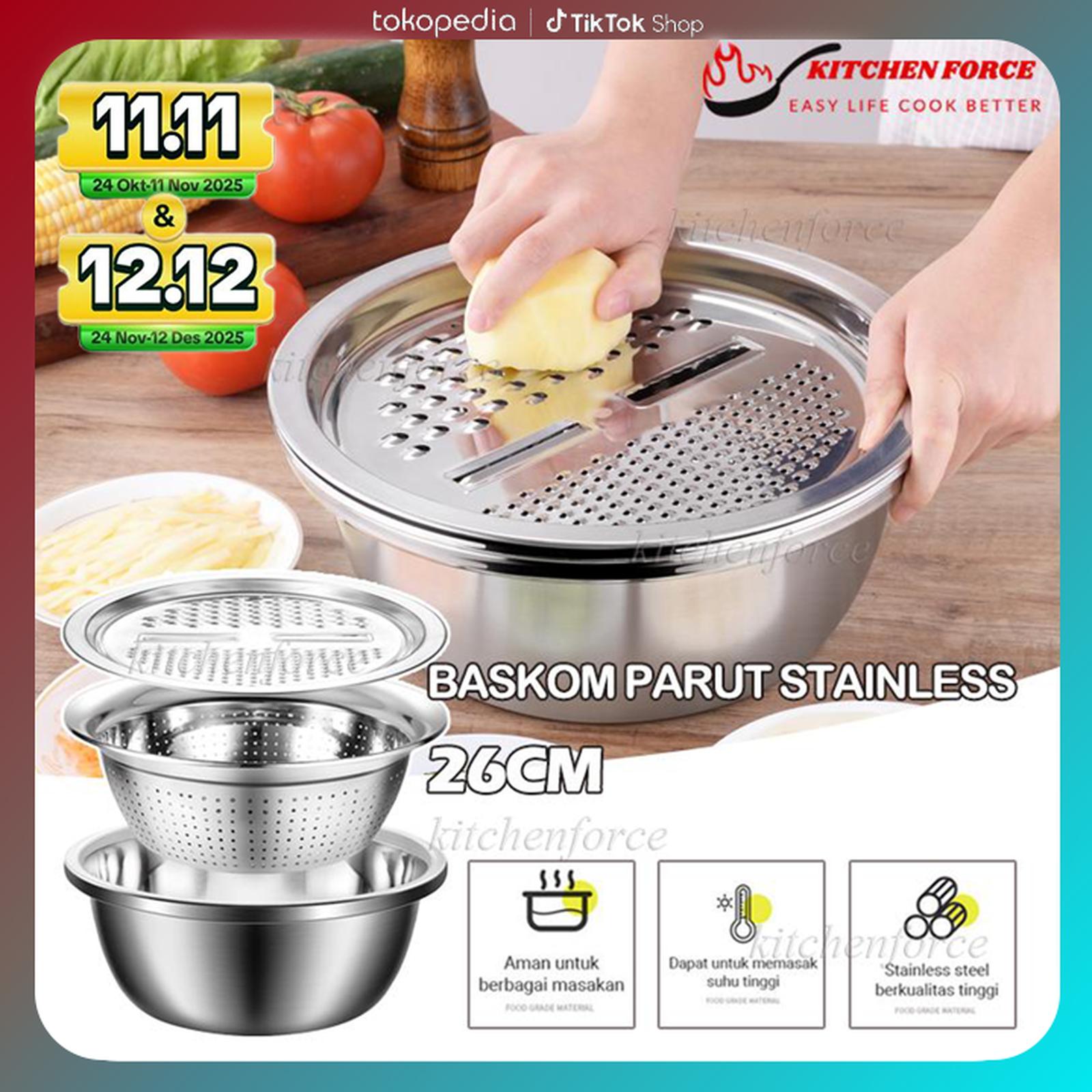 | 3 Fungsi dalam 1 Set | Dilengkapi dengan 1 saringan halus, 1 baskom stainless, dan 1 mata parut pengupas model korek api (julienne). |