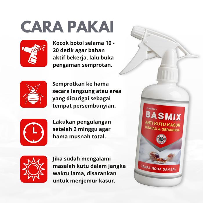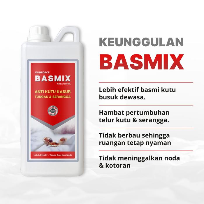 Basmix adalah formula khusus yang dirancang untuk membasmi kutu busuk, tungau, dan telurnya hingga tuntas. Solusi ampuh dan praktis untuk mengembalikan kenyamanan dan kebersihan tempat tidur, sofa, serta seluruh rumah Anda dari gangguan serangga.